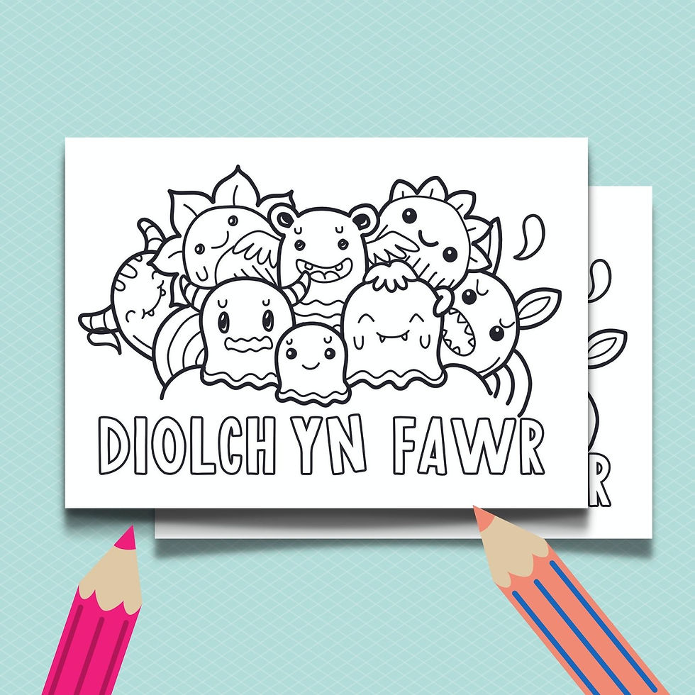 Welsh Thank You, Diolch yn Fawr Colour in Monster Postcards -Pack of 6
